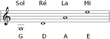 A violin is tuned in fifths, in the notes G3, D4, A4, E5. The lowest note of a violin, tuned normally, is G3, or G below middle C. (On rare occasions, the lowest string may be tuned down by as much as a fourth, to D3.) The highest note is less well defined: E7, the E two octaves above the open string (which is tuned to E5) may be considered a practical limit for orchestral violin parts,[19] but it is often possible to play higher, depending on the length of the fingerboard and the skill of the violinist. Yet higher notes (up to C8) can be sounded using artificial harmonics.