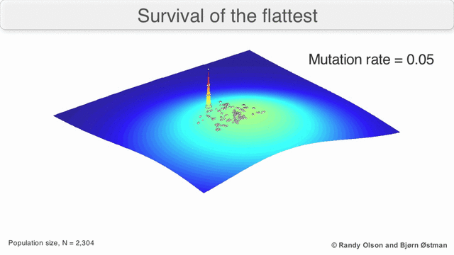 - Video: Using fitness landscapes to visualize evolution in action -- contains an example of "survival of the flattest"