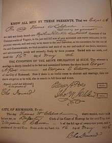 Marriage plans were confirmed and Poe returned to Baltimore to file for a marriage license on September 22, 1835. The couple might have been quietly married as well, though accounts are unclear.[22] Their only public ceremony was in Richmond on May 16, 1836, when they were married by a Presbyterian minister named Rev. Amasa Converse.[23] Poe was 27 and Virginia was 13, though her age was listed as 21.[23] This marriage bond was filed in Richmond and included an affidavit from Thomas W. Cleland confirming the bride's alleged age.[24] The ceremony was held in the evening at the home of a Mrs. James Yarrington,[25] the owner of the boarding house in which Poe, Virginia, and Virginia's mother Maria Clemm were staying.[26] Yarrington helped Maria Clemm bake the wedding cake and prepared a wedding meal.[27] The couple then had a short honeymoon in Petersburg, Virginia.[25]
