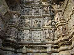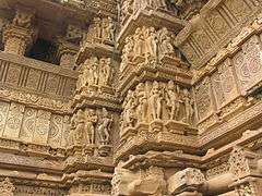 The north and south walls of the temple feature erotic reliefs.[14][18] The junction of the vestibule and the sanctum features a variation of the famous "acrobatic sex" sculpture at the newer Kandariya Mahadeva temple. Like the Kandariya sculpture, this one also features a couple supported by two women, but in this sculpture, the man is on the top. The woman at the bottom fingers the woman on the left with one hand, while her other hand rests on the ground for support. Some sculptures feature men indulging in bestiality, as women cover their eyes.[17]