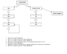 Visna Maedi virus is a retrovirus meaning its genome consists of a (+)RNA that undergoes reverse transcription and then is integrated into the host's genome after infection. This integration is what leads to VMV's lifelong persistent infection.[7] VMV has a long incubation period. During the initial outbreak among sheep in Iceland, there was no sign of clinical disease until six years after the importation of the Karakul sheep, which brought the virus from Germany to Iceland.[18] Susceptibility to infection also increases with a higher level. VMV infects cells of the monocyte lineage, but only replicates at high levels when the monocytes are more mature/differentiated.[19] of maturity/differentiation of the monocytes. Infected differentiated monocytes, also known as macrophages, will continuously present VMV antigens inducing T-lymphocytes to produce cytokines that in turn induce the differentiation of monocytes.[7]