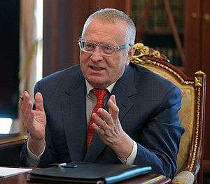 Vladimir Volfovich Zhirinovsky (Russian: Влади́мир Во́льфович Жирино́вский; né Eidelstein (Russian: Эйдельште́йн) on 25 April 1946) is a Russian politician and leader of the Liberal Democratic Party of Russia. He is fiercely nationalist and has been described as "a showman of Russian politics, blending populist and nationalist rhetoric, anti-Western invective and a brash, confrontational style".[1] His views have been described as fascist.[2][3][4]