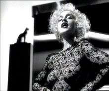 Filmed in black-and-white, the video recalls the look of films and photography from The Golden Age of Hollywood with the use of artwork by the Art Deco artist Tamara de Lempicka and an Art Deco set design. Many of the scenes are recreations of photographs taken by noted photographer Horst P. Horst, including his famous "Mainbocher Corset", "Lisa with Turban" (1940), and "Carmen Face Massage" (1946). Horst was reportedly "displeased" with Madonna's video because he never gave his permission for his photographs to be used and received no acknowledgement from Madonna.[32] Some of the close-up poses recreate noted portraits of such stars as Marilyn Monroe, Veronica Lake, Greta Garbo,[33] Marlene Dietrich, Katharine Hepburn, and Jean Harlow. (Additionally, several stars of this era were name-checked in the song's lyrics.)[34] Several famous Hollywood portrait photographers whose style and works are referenced include George Hurrell,[35][36] Eugene Robert Richee,[37] Don English,[38] Whitey Schafer, Ernest Bachrach, Scotty Welbourne, Laszlo Willinger, and Clarence Sinclair Bull.[39]