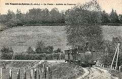 Signalling was itself minimal because of the small number of journeys (generally six a day before the First World War, and a few infrequent freight trains each week, fewer after 1914).[9] Road users were warned of level crossings by simple traffic signs saying Attention au train, which in the 1930s were augmented by the Cross of St Andrew; never a barrier. Stations were built in the same style, of small dimensions: a little waiting room and, attached to it, a modest ticket hall leading to a platform long enough to serve the most populous locality. A simple shelter or just a signpost marked out halts or flag stops.[10]