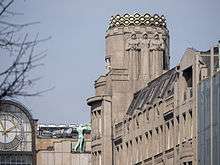 Koruna Building, with the three figures by Vojtěch Sucharda