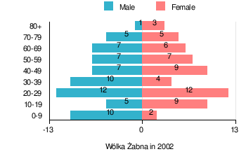 According to the 2002 Poland census, there were 121 people residing in Wólka Żabna village, of whom 52.9% were male and 47.1% were female. In the village, the population was spread out with 17.4% under the age of 18, 43% from 18 to 44, 20.7% from 45 to 64, and 19% who were 65 years of age or older.[1]