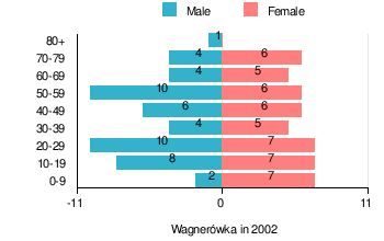 According to the 2002 Poland census, there were 98 people residing in Wagnerówka village, of whom 50% were male and 50% were female. In the village, the population was spread out with 22.4% under the age of 18, 33.7% from 18 to 44, 25.5% from 45 to 64, and 18.4% who were 65 years of age or older.[1]