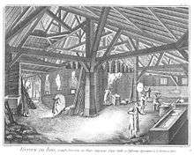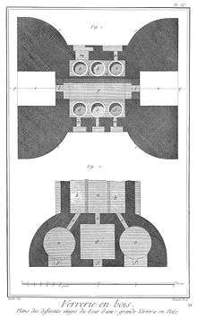 Besides the descriptions of Theophilus and Agricola, the only depiction of an early forest glasshouse is from Bohemia in about 1380 (The Mandeville Miniature).[3] This shows a furnace where all the high temperature processes of glass-making were performed in the one structure containing several ovens whose varying temperatures might be controlled to the necessary extent by constant attention. The raw materials are mixed at a pit nearby and carried down in pans to be fritted in one of the ovens, optimum temperature up to 1100 °C. The frit is melted at high temperature up to 1400 °C in crucibles in a second oven, and when ready the glass is being blown into objects. These are placed in the annealing oven to cool. The whole structure is enclosed in a wooden building, and it is likely that wood was stored and dried above the furnace.[15][16] Remains of a similar structure from the late 15th century have been found in Eichsfeld in Germany.[3] Another design found archaeologically from the 17th century is the 'butterfly furnace'. These furnaces were made from stone and the crucibles from imported highly-refractory clay.[15] They differ in style from the Islamic furnaces of the east, and those of southern Europe, the 'beehive' style where the annealing chamber is above the main oven rather than on the same level.[1]