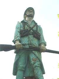 Framerville-Rainecourt | At Framerville-Rainecourt is a war made by Jules Déchin (1869–1947). The sculpture features a soldier with rifle, leaning against a post which carries the inscription "Framerville". This work dates from 1925 and is situated by the old cemetery just by the church. The pedestal also carries an inscription acknowledging the soldiers of the British and Australian Armies who died in this area. The monument was inaugurated on 26 September 1926.[13] |