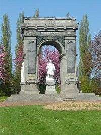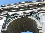 The monument was erected in 1924 and the land involved was the gift of Mr.and Mrs Normand who also put up most of the funds involved in erecting the monument. Mr. Normand was a wine merchant in the Champagne area. The Normands had lost their only son, killed in combat in the Great War and the monument stands in the grounds of the local chateau owned by the Normand family. Another contributor to the cost of this monument was the town of Cognac who had "adopted" Proyart during the war. The monument was inaugurated on 28 September 1924 by General de Castelnau who had commanded the French army in the Somme from September 1914 to August 1915. On the sides of the arch are three bas-reliefs: "Le Départ", "L’assaut à Proyart", and "La France reconnaissante à Proyart." The relief "L’assaut à Proyart" shows eight soldiers advancing towards the enemy lines including one with field glasses, another on look-out and a third with a periscope. In the distance another group of soldiers are in the same trench. The relief shows trees which had been destroyed and the barbed wire of no man's land. The relief "Le Départ" portrays a soldier saying goodbye to his family; his wife, his child, his mother, all in front of the family home. In the rear there is a village and its church. The relief "La France reconnaissante" is an allegory of a victorious France wearing a phrygien bonnet and a crown of laurel and embracing a soldier holding the national flag. A battalion of soldiers is shown marching by and there is the Arc de Triomphe in Paris encircled by torches of fire.[32] The central figure of the soldier is carved from marble and the rifle is made from cast iron. The soldier's foot rests on a German helmet (the point at the top of the helmet is no longer there). |