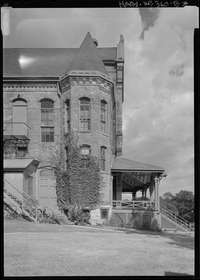 Prominent Milwaukee architect Henry C. Koch designed Ward Memorial Hall in the High Victorian Gothic Revival and Romanesque Revival styles, with a theater/meeting room, commissary store, restaurant, and railroad passenger station.[2] This unusual combination of building uses was to serve the growing recreational needs of the Milwaukee Soldiers Home.[2] It has a wide veranda wrapping around three sides.
