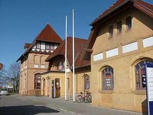 Warnemünde station is located in the seaside resort of Warnemünde, a district of the Hanseatic city of Rostock in the German state of Mecklenburg-Vorpommern. The station opened on 30 September 1903 and is located on the Neustrelitz–Warnemünde railway. It is the terminus of all three Rostock S-Bahn lines. In addition, some long-distance trains serve the station. Until 1995, it was the starting point of ferries to Gedser in Denmark. The station building and some other facilities of the station have heritage protection.