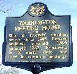 - ↑ "National Historic Landmarks & National Register of Historic Places in Pennsylvania" (Searchable database). CRGIS: Cultural Resources Geographic Information System. Note: This includes William K. Watson (October 1974). "National Register of Historic Places Inventory Nomination Form: Warrington Meetinghouse" (PDF). Retrieved 2011-12-18.