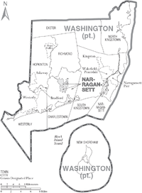 Map of Washington County, Rhode Island showing towns, census-designated places, and Narragansett tribal lands