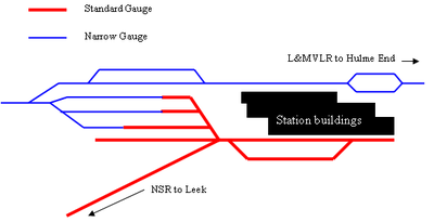 The station was the terminus of two separate railway lines; the 4 ft 8 1⁄2 in (1,435 mm) standard gauge NSR branch from Leekbrook Junction and the 2 ft 6 in (762 mm) narrow gauge L&MVLR from Hulme End. Both lines were authorised on 1 March 1899 by the Leek, Caldon Low, and Hartington Light Railways Order, 1898.[3][4]