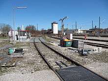 The Weilheim station originally had three mechanical signal boxes. Signal box 1 controlled movements between different parts of the station precinct and was located at the northern end of the station west of the tracks. Signal box 2 was operated by the train despatcher and was situated south of the entrance building between the local loading tracks and the station building. Both were mechanical interlocking of the Krauss class of 1902. Signal box 3 was a mechanical interlocking of the Krauss class of 1925, which controlled the marshalling yard and was located at the southern end of the sidings to the west of the station. In 1983, the three signal boxes were replaces by a centralised signal box with a track-plan push-button interlocking of the Lorenz L60 class, which is housed in an cubic, three-storey building with an attached observation deck.[5] This signal box controls, in addition to the Weilheim station area, the Wilzhofen and Polling areas.[14] The signal box is located on the main platform north of the entrance building.