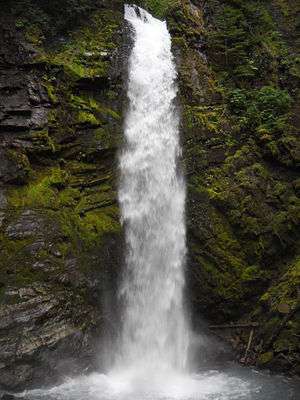 One of the better known falls on the slopes of Mount Baker, the falls are a single plunge of 90 feet (27 m) within a small gorge which the falls mark the beginning of. Several thousand feet downstream from the falls, the creek passes under Wells Creek Road & immediately is joined by Wells Creek’s only major tributary, Bar Creek. A large culvert, rather than a bridge crosses the creek along Wells Creek Road.