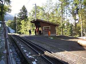 The station is located on the new line from Lauterbrunnen to Wengen, which opened in 1910 to replace the more direct but steeper original routing. It is immediately uphill of an 180 degree helical tunnel which the line uses in order to reduce the gradient.[1]