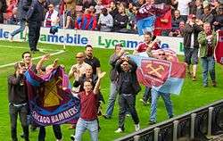 West Ham United F.C. supporters are the followers of the London-based West Ham United Football Club, who were founded as Thames Ironworks in 1895. There are 700,000 fans on the club's database and over 1,000,000 likes on Facebook.[1] The club's website is in the top ten most visited websites for English football clubs by people in the USA.[2] Their fans are also associated with a once-notorious hooligan element[3] and have long-standing rivalries with several other clubs, most notably Millwall.