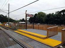 After demolition work over the next several months, the new parking lot was graded in June 2012 and a temporary platform was constructed west of the old one.[10] Construction of the 204-foot-long platforms took place in the third quarter of 2012, while the pedestrian bridge was lifted into place in March 2013.[12] The station was delayed by the unexpected discoveries of a buried concrete mass and utilities under the new station site.[13] The new station was formally opened on March 25, 2014.[1] Full bidirectional service to Westbrook began with the schedule change of May 11, 2014.[14]