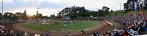 Western Springs Stadium was built on land purchased from the Motion family by Auckland City Council in 1875 in order to build the Western Springs reservoir and pump station.[1] Situated in a natural amphitheatre, concrete terracing was constructed. It was designed and modelled on European stadiums which included a banked concrete cycling track, a cinder running track and a grassed centre area for football and sports. The original design included a covered grandstand which would fill the gap between the concrete terraces, the cycling track finishing straight was designed and built to start and finish in front of the proposed grandstand (where the pit area now is). The stadium was never completed.