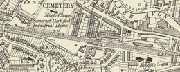 The goods depot was opened in 1877, freeing space at the constrained Bath Spa station site. A small engine shed was also moved from Bath Spa to Westmoreland in 1880. The goods depot was located on the up side of the line, fronting onto the Lower Bristol Road, opposite the Newark Works of crane makers Stothert & Pitt.[5] Further west on the down side towards Oldfield Park railway station, on the other side of Westmoreland Road, was located a goods loop and four sidings, called Bath West.[4]