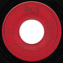 RCA released "When You Say Nothing at All" as the follow-up single to the title song of Whitley's Don't Close Your Eyes album. The former song already had hit No. 1 on the Billboard Hot Country Singles chart, his first chart-topper after three prior singles made the top 10.[3] "When You Say Nothing at All" entered the Hot Country Singles chart on September 17, 1988, at No. 61, and gradually rose to the top, where it stayed for two weeks at the end of the year.[1][2] It was the second of five consecutive chart-topping singles for Whitley, who did not live to see the last two, as he died on May 9, 1989 of alcohol poisoning.[3] "Keith did a great job singin' that song," co-composer Schlitz told author Tom Roland. "He truly sang it from the heart."[2] In 2004, Whitley's original was ranked 12th among CMT's 100 Greatest Love Songs.[4] It was sung by Sara Evans on the show. As of February 2015, the song has sold 599,000 digital copies in the US after it became available for download.[5]