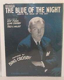 "Where the Blue of the Night (Meets the Gold of the Day)" was the theme Bing Crosby selected for his radio show. It was recorded in November 1931, backed by Bennie Krueger's band. The song was featured in a Mack Sennett movie short[1] starring Bing Crosby. Crosby recorded the song on several occasions starting with the November 23, 1931 version. He next recorded it on July 20, 1940 with The Paradise Island Trio. On July 17, 1945 he recorded it with John Scott Trotter and his Orchestra and his final recording was on April 21, 1954 with Buddy Cole and his Trio for his Musical Autobiography set.[2]
