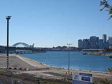 White Bay is named after John White, the naval surgeon aboard the First Fleet to Australia in 1788.[1] Since the nineteenth century the bay has been used for water-based transport and industrial activities. In conjunction with adjacent Glebe Island it has been a multipurpose port, owned and controlled by the Government of New South Wales since 1901.[2][3] It caters for container handling, break bulk cargo (timber, paper, motor vehicles and steel) and dry bulk cargoes (cement, sugar, gypsum, aggregates, etc.).