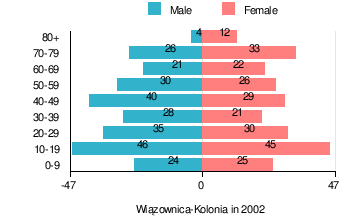 According to the 2002 Poland census, there were 497 people residing in Wiązownica-Kolonia village, of whom 51.1% were male and 48.9% were female. In the village, the population was spread out with 25.4% under the age of 18, 33.4% from 18 to 44, 20.3% from 45 to 64, and 20.9% who were 65 years of age or older.[1]