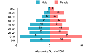 According to the 2002 Poland census, there were 706 people residing in Wiązownica Duża village, of whom 48.9% were male and 51.1% were female. In the village, the population was spread out with 33.3% under the age of 18, 37.1% from 18 to 44, 16.4% from 45 to 64, and 13.2% who were 65 years of age or older.[1]