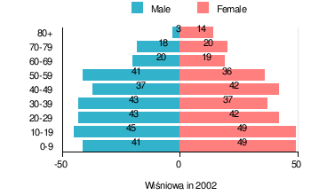 According to the 2002 Poland census, there were 599 people residing in Wiśniowa village, of whom 48.6% were male and 51.4% were female. In the village, the population was spread out with 27.5% under the age of 18, 37.4% from 18 to 44, 20.9% from 45 to 64, and 14.2% who were 65 years of age or older.[1]