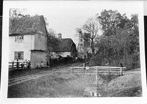 Old photograph of Church Walk Wilden, circa 1900, showing Village Farm, the Post Office (now known as Tudor Cottage), and St Nicholas Church.