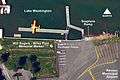 Seaplane (float plane) docks, floats, and ramp. Lake Washington at top (North), West Perimeter Road in lower-left corner. Renton Municipal Airport Perimeter fence bisects the land area at bottom (South), with personnel gate P-1 to the right and the Will Rogers - Wiley Post Memorial marker immediately to the left (East).