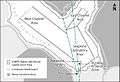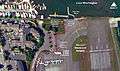 Area overview of the Will Rogers – Wiley Post Memorial Seaplane Base showing the perimeter fence restricting access, nearby streets, the Cedar River, U.S. Customs building, and memorial marker.