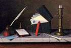 The style of trompe-l'œil painting that Harnett developed was distinctive and inspired many imitators,[1] but it was not without precedent. A number of 17th century Dutch painters, Pieter Claesz for instance, had specialized in tabletop still life of astonishing verisimilitude. Raphaelle Peale, working in Philadelphia in the early 19th century, pioneered the form in America. What sets Harnett's work apart, besides his enormous skill, is his interest in depicting objects not usually made the subject of a painting.