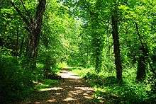 Natural areas include forested portions, wetlands, and a community garden.[1] A portion of the park on the northern edge is forested and nicknamed as Owl Woods due to the presence of a great horned owl.[32] Other birds that inhabit the park include wrens, pileated woodpeckers, grosbeaks, red-tailed hawks, and bald eagles on occasion.[32] The park includes the Ernest Kolbe Giant Sequoia, selected as one of the city’s heritage trees.[33]