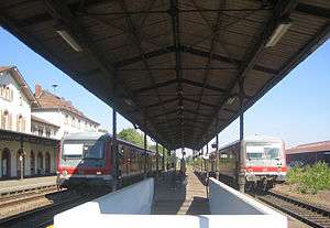 Three services and hour run towards Neustadt from platform 3. In the opposite direction, two services an hour run to Karlsruhe and one an hour to Wissembourg. These stop either on platform track one or two. The trains running every hour from Bergzabern stop on platform 2. Similarly, a regular bus route runs to Bad Bergzabern, mainly to serve the villages that lie off of the spa line.