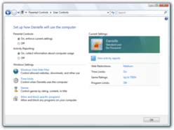 Windows Vista includes a range of parental controls for non-domain user accounts. Parental controls allows administrators to set restrictions on, and monitor, computer activity. Parental controls relies on User Account Control for much of its functionality. Features include: