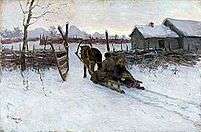 It is possible that a series of severe winters in France also contributed to an increase in the number of winter landscapes produced by Impressionists.[26] Impressionist painters like Claude Monet, Alfred Sisley and Camille Pissarro started painting large numbers of winter landscapes in which they experimented with the use of light and color to paint what they called the effets de neige (the effects of snow). Other painters who painted winter landscapes but less frequently were Pierre-Auguste Renoir, Gustave Caillebotte and Paul Gauguin. The French master Claude Monet's first painting in his winter series of 140 paintings was A Cart on the Snowy Road at Honfleur, which was followed by many other winter landscapes, including a long series with haystacks.[27] In the painting Boulevard Saint Denis, Monet sought to catch the moment when the sun was hidden behind the clouds during a light snowfall.[22] In The Magpie, Monet's largest and probably most widely known winter painting, he used blue-gray colors to depict shadows in the snow.[28][29]