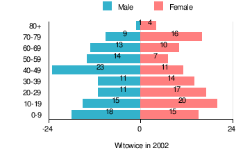 According to the 2002 Poland census, there were 229 people residing in Witowice village, of whom 50.2% were male and 49.8% were female. In the village, the population was spread out with 27.5% under the age of 18, 32.3% from 18 to 44, 19.2% from 45 to 64, and 21% who were 65 years of age or older.[1]