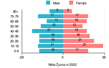 According to the 2002 Poland census, there were 289 people residing in Wola Żyzna village, of whom 47.8% were male and 52.2% were female. In the village, the population was spread out with 23.5% under the age of 18, 33.6% from 18 to 44, 18.7% from 45 to 64, and 24.2% who were 65 years of age or older.[1]