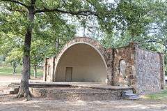 The Woman's Community Club Band Shell is a historic open-air band shell in Spring Park, a public park in downtown Heber Springs, Arkansas. It is a roughly rectangular structure, built out of local fieldstone, with the main half-dome shell formed out of concrete. The sides of the shell are articulated by pilasters, which also appear at the building corners. The rear of the building is enclosed, provide dressing room space for performers. The shell was built in 1933, replacing an older wood-frame performance pavilion.[2]