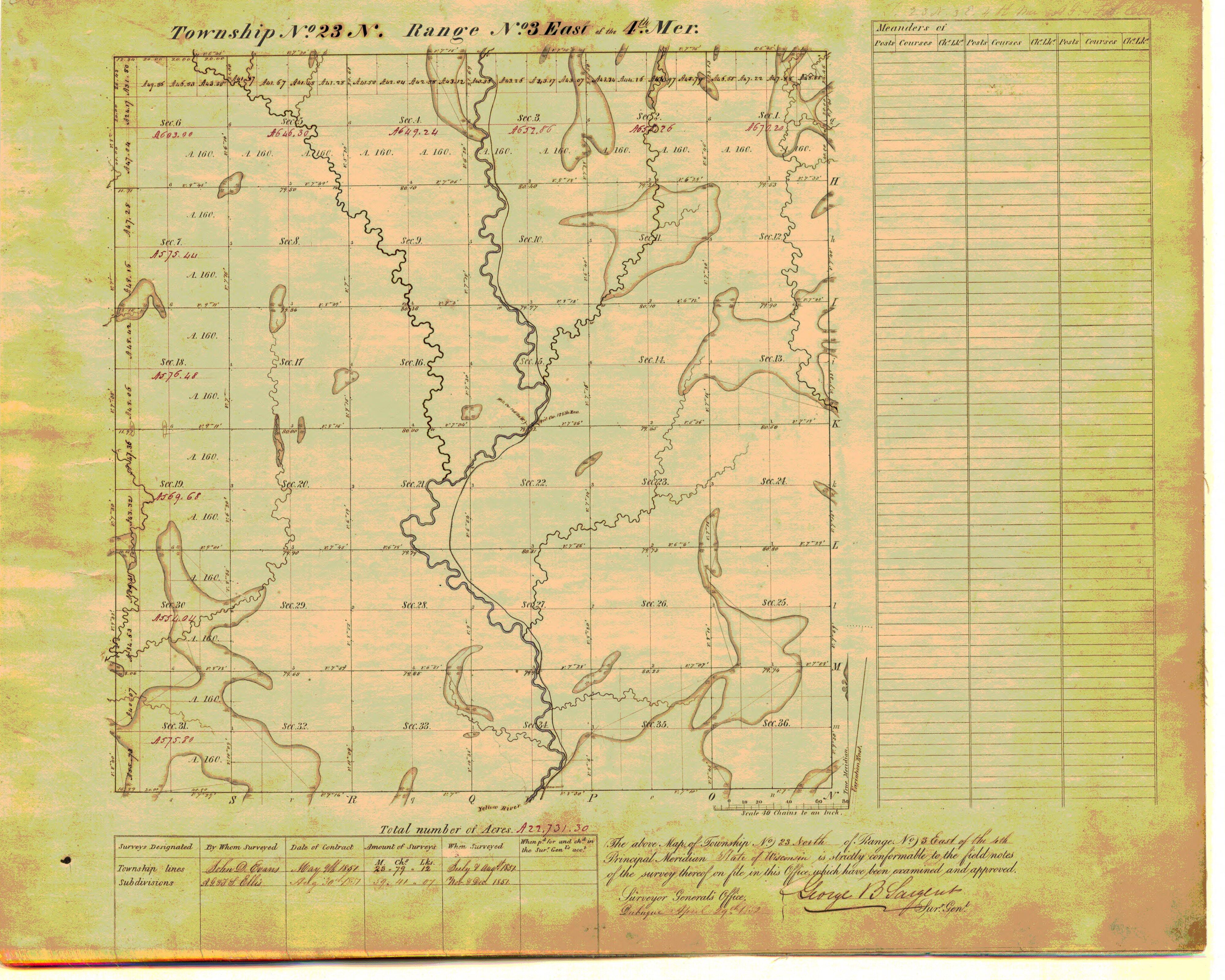 There is very little good land in this Township it may be considered as 2d rate the timber is generall good except the Pine although there is some good Pine along the Banks of Yellow River mixed in with hard timber the surface is generall level & somewhat stony particularly near(?) Yellow River which passes over almost entirely a Bed of Rocks the stone are a Reddish sand stone the timber is of various Kinds, such as Birch Pine Maple Linn Elm Tamarack etc(?) the small streams are fed by the swamp and are not durable the Saw Mills under process of Erection are probably worth $500 each.[5]
