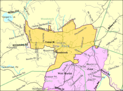 Woodstock is a hamlet (and census-designated place) in Ulster County, New York, United States. The population was 2,088 at the 2010 census. The community of Woodstock is in eastern part of the Town of Woodstock and is northeast of Kingston, New York. It is located along NY 212 near its junction with NY 375. Although the name of the community and the town lent its name to the Woodstock Festival, that event did not take place in Woodstock.