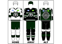 The third jersey from the 2009-10 season was tweaked for use as the regular jersey beginning in the 2010-11 season until the present. The home jersey was made white with a thick green stripe across the center of the jersey and the elbow of both arms. Above and below this thick stripe are thin stripes of black. The bottom of the jersey has a black stripe above a green stripe above a white stripe. A green maple leaf was added to each shoulder to denote the team's location in Canada. The away jerseys is inverted, the black stripes being replaced with white ones, the jersey itself going from white to black.