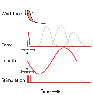To simulate the rhythmic shortening and lengthening of a muscle (e.g. while moving a limb), a servo motor oscillates the muscle at a given frequency and range of motion observed in natural behavior. Simultaneously, a burst of electrical pulses is applied to the muscle at the beginning of each shortening-lengthening cycle to stimulate the muscle to produce force. Since force and length return to their initial values at the end of each cycle, a plot of force vs. length yields a 'work loop'. Intuitively, the area enclosed by the loop represents the net mechanical work performed by the muscle during a single cycle.