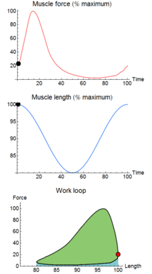 A work loop combines two separate plots: force vs. time and length vs. time. When force is plotted against length, a work loop plot is created: each point along the loop corresponds to a force and a length value at a unique point in time. As time progresses, the plotted points trace the shape of the work loop. The direction in which the work loop is traced through time is a critical feature of the work loop. As the muscle shortens while generating a tensile force (i.e. "pulling"), then, by convention in, the muscle is said to be performing positive work during that phase. As the muscle lengthens (while still generating a tensile force), the muscle is performing negative work (or, alternatively, that positive work is being performed on the muscle). Thus a muscle generating force while shortening is said to output 'positive work' (i.e. generating work), whereas a muscle generating force while lengthening produces 'negative work' (i.e. absorbing work). Over an entire cycle, there is typically some positive, and some negative work; if the overall cycle is counter-clockwise vs. clockwise work loop represents overall work generation vs. work absorption, respectively.[8] For example during a jump, the leg muscles generate work to increase the body's speed away from the ground, yielding counter-clockwise work loops. When landing, however, the same muscles absorb work to decrease the body's speed, yielding clockwise work loops. Furthermore, a muscle can produce positive work followed by negative work (or vice versa) within a shortening-lengthening cycle, causing a 'figure 8' work loop shape containing both clockwise and counter-clockwise segments.[9]