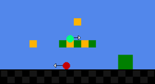 At the start of "World 1-1", the player—taking control of Mario—comes across a Goomba slowly moving towards them. According to 1UP.com, it is likely that this first enemy will kill a new player, even though the enemy can easily be avoided by jumping over it. As barely any progress is lost, the player learns from their defeat and can try again.[1] After passing this Goomba, the player comes across an arrangement of blocks, a few of which are colored in gold. By tapping one of the gold-colored blocks from below, a coin pops out. According to Miyamoto, seeing a coin come out will "make [the player] happy" and want to repeat the action. Doing so for the next gold-colored block makes a Mushroom come out; a power-up that moves towards Mario in such a way that, due to the arrangement of blocks, it is difficult to evade. Being hit by the Mushroom makes Mario grow in size, another positive reinforcement.[2][4]