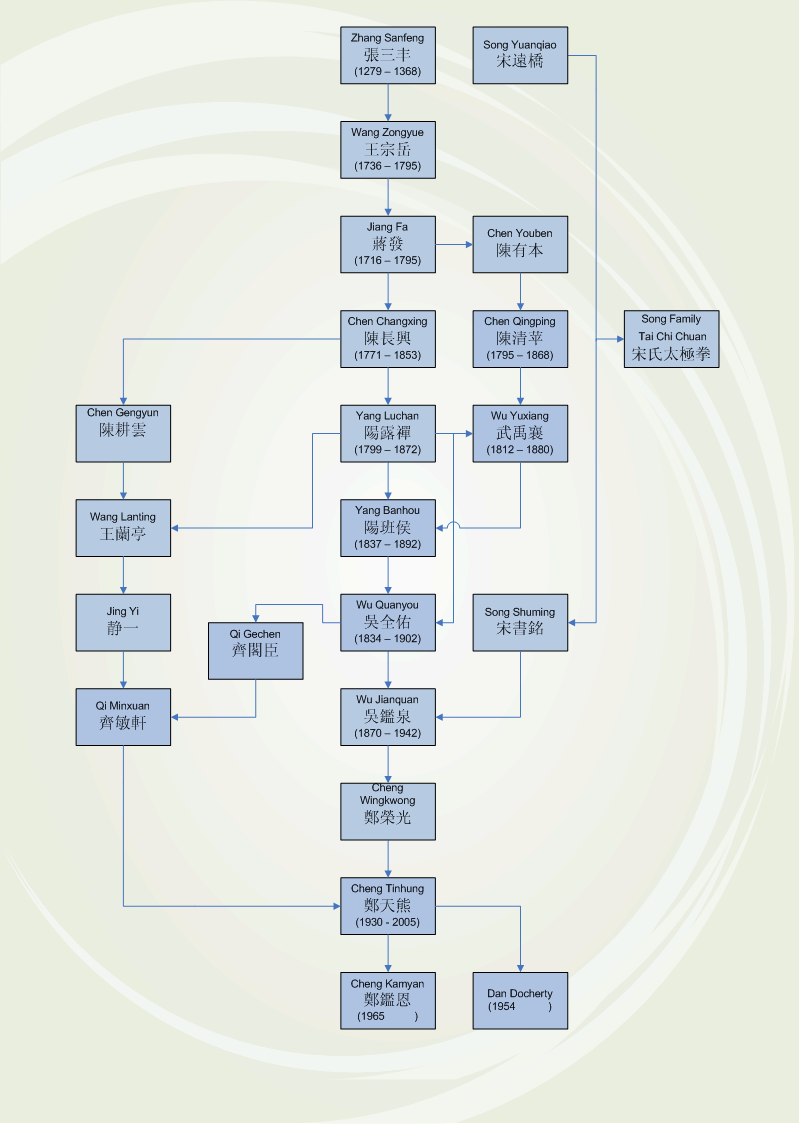 The Wudang t'ai chi ch'uan system teachers publish that they have links to famous T'ai chi ch'uan masters (see lineage diagram), including Yang Banhou, Wu Quanyou, Wu Jianquan, Cheng Wingkwong (Zheng Rongguang, 鄭榮光), Chen Gengyun (陳耕雲) and Wang Lanting (王蘭亭).